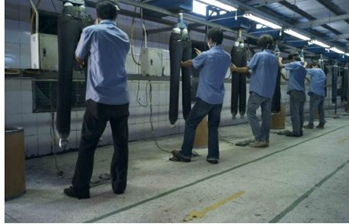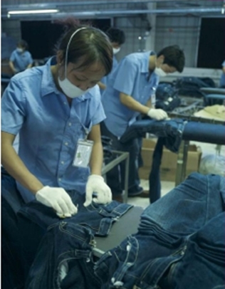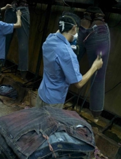 三:臭氧氧化與傳統(tǒng)方法的優(yōu)缺點(diǎn)比較 1. 用次氯酸鈉(婆梅度為18度)經(jīng)濟(jì);不好控制,有傷布的纖維。健康危害:經(jīng)常用手接觸本品的工人,手掌大量出汗,指甲變薄,毛發(fā)脫落。本品有致敏作用。本品放出的氯氣有可能引起中毒。具腐蝕性,可致人體灼傷,具致敏性。 2. 用亞氯酸鈉和硫酸在加次氯酸鈉。價(jià)格比上一種高點(diǎn)。但比上一種好點(diǎn)。不傷布的纖維。亞氯酸鈉有強(qiáng)氧化性。在175℃時(shí)即分解而發(fā)熱,與可燃物質(zhì)接觸,即起猛烈爆炸,須注意安全。硫酸對環(huán)境有危害,對水體和土壤可造成酸性污染。具強(qiáng)腐蝕性、強(qiáng)刺激性,可致人體灼傷。 3. 高錳酸鉀、過醋酸和還原漂白方式 關(guān)于牛仔布漂白,除了用次氯酸鈉和亞氯酸鈉外,還可以用高錳酸鉀、過醋酸和還原漂白方式,具體需要根據(jù)牛仔布所用染料類型來選擇,傳統(tǒng)牛仔為還原淀籃染料,也有用硫化染料或直接染料代替,也有采用活性染料代替的,故此,需要根據(jù)具體情況考慮。 4. 臭氧氧化的優(yōu)點(diǎn) a) 無污染,臭氧為純凈物。在常溫下,易分解,生成氧氣和氧原子 b) 臭氧的氧化能力極強(qiáng)。 c) 運(yùn)行成本低 四:手工處理 1.手擦 a) 在洗水前,通過使用砂輪滾動摩擦而使布面染料褪色,手擦的地方通常是脾位和臀位,人為的機(jī)械褪色,讓牛褲在洗水后顯得自然地懷舊和泛白 b) 噴沙和手擦效果接近,但對布紋的效果有差別。噴沙后布紋模糊,沉底,而手擦后布紋清晰凸顯
