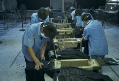 4.打搶.手針 用線將牛褲某些部位縫起,凸出的部位由于在洗水過程中受的的摩擦較多,從而掉色較嚴(yán)重,水洗效果也較明顯,而凹入的部位在洗水過程中受的的摩擦較少,從而掉色較輕,水洗效果不明顯。同沒做手針的其它部位形成深中淺的三種洗水效果 5.立體貓須 將衣物浸免燙樹脂并脫水后,在特定部位用夾子夾出需要的形狀,起伏度,然后再高溫烘焙,讓樹脂交聯(lián)定型,從而制出永久的立體褶皺效果